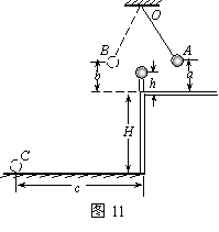 13、(6分)如图11所示是用来验证动量守恒的实验装置,弹性球1用细线悬挂于O点,O点下方桌子的边缘有一竖直立柱.实验时,将球1拉到A点,并使之静止,同时把球2放在立柱上.释放球1,当它摆到悬点正下方时与球2发生对心碰撞.碰后球1向左最高可摆到B点,球2落到水平地面上的C点.测出有关数据即可验证1、2两球碰撞时动量守恒.现已测出A点离水平桌面的高度为a.B点离水平桌面的高度为b,C点与桌子边缘间的水平距离为c.此外,还需要测量的量是_________、________________、 和_____________________.根据测量的数据,该实验中动量守恒的表达式为_________________________ (2分) .