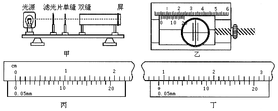 20(14分).某同学用如图甲所示的实验装置,做《用双缝干涉测光的波长》的实验,他用带有游标尺的测量头(如图乙所示)测量相邻两条亮条纹间的距离Δx.转动测量头的手轮,使分划板的中心刻线对齐某一条亮条纹(将这一条纹确定为第一亮条纹)的中心,此时游标尺上的示数情况如图丙所示,读数用x1表示;转动测量头的手轮,使分划板的中心刻线对齐第6亮条纹的中心,此时游标尺上的示数情况如图丁所示,则图丙的示数x1=_________mm;则图丁的示数x2=_________mm.如果实验中所用的双缝间的距离d=0.20mm,双缝到屏的距离L=60cm,则计算波长的表达式λ=_________(用d、L、x1、x2表示).根据以上数据,可得实验中测出的光的波长λ=_________m.