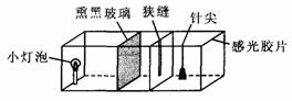 22.(10分)在实验室做了一个这样的光学实验,即在一个密闭的暗箱里依次放上小灯泡(紧靠暗箱的左内壁)、烟熏黑的玻璃、狭缝、针尖、感光胶片(紧靠暗箱的右内壁),整个装置如图所示,小灯泡发出的光通过熏黑的玻璃后变得十分微弱,经过三个月的曝光,在感光胶片上针头影子周围才出现非常清晰的衍射条纹.对感光胶片进行了光能量测量,得出每秒到达感光胶片的光能量是5×10-13J.假如起作用的光波波长约为500 nm,且当时实验测得暗箱的长度为1. 2 m,若光子依次通过狭缝,普朗克常量h=6. 63×10-34J·s.求:
