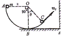 (12分)如图所示,一半径为R的光滑圆弧轨道ABC,固定在竖直面内,O为其圆心,O、A等高。水平面BE与轨道相切于B点,且0〈θ〈π/2。今将一质量为m的小球从轨道顶端A静止释放,沿轨道下滑,从C端飞出后,与竖直墙壁正碰于D点(未画出),求距离BE和DE的长度。