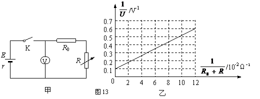 (6分)现有一种特殊的电池,它的电动势E约为9V,内阻r约为40Ω,已知该电池允许输出的最大电流为50mA,为了测定这个电池的电动势和内阻,某同学利用如图甲所示的电路进行实验,图中电压表的内阻很大,对电路的影响可不考虑,R为电阻箱,阻值范围0-9999Ω,R0是定值电阻,可防止操作不当损坏电池,起保护电路的作用。 www.k@s@5@