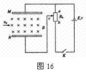(10分)如图16所示,M、N为水平放置的两平行金属板,相距为d,两极板间匀强磁场的磁感应强度为B,方向垂直纸面向里,电源内阻为r,滑动变阻器a、b间电阻为R0,一个带电量为-q,质量为m的带电粒子(不计重力)从左端两板中央以速度v0沿水平方向射入磁场。当K断开时,带电粒子恰好沿着1/4圆弧垂直打在金属板上。