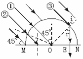 ,当光由玻璃射向空气时,发生全反射的临界角为45°.一束与MN平面成45°的平行光束射到玻璃的半圆柱面上,经玻璃折射后,有部分光能从MN平面上射出.求能从MN射出的光束的宽度为多少?