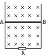 22、光滑 U 形导轨, 竖直放置在垂直于纸面向里的匀强磁场中,已知导轨宽L=0.5m,磁感应强度B=0.2T。有一电阻为零,质量为0.01kg的导体棒AB紧挨导轨,沿着光滑导轨由静止开始下落,如图所示,设串联在导轨中的电阻R阻值为2Ω,其他部分的电阻及接触电阻均不计.问: