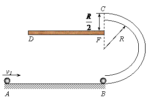 35. (18分)如图所示,一质量m1=0.2kg的小球,从光滑水平轨道上的一端A处,以v1=2.5m/s的速度水平向右运动. 轨道的另一端B处固定放置一竖直光滑半圆环轨道(圆环半径比细管的内径大得多),轨道的半径R=10cm,圆环轨道的最低点与水平轨道相切;空中有一固定长为15cm的木板DF,F端在轨道最高点C的正下方,竖直距离为5cm。水平轨道的另一端B处有一质量m2=0.2kg的小球,m1、m2两小球在B处发生的是完全弹性碰撞,重力加速度为g=10m/s2. 求: