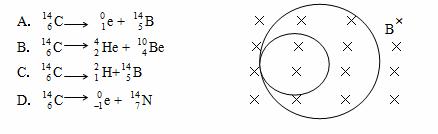 18、在匀强磁场中有一个原来静止的碳14原子核,它放射出的粒子与反冲核的径迹是两个内切的圆,两圆的直径之比为7:1,如图所示,那么碳14的衰变方程为( )