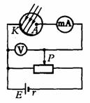 19、如右上图所示,已知用光子能量为2.82eV的紫光照射光电管中的金属涂层时,毫安表的指针发生了偏转。若将电路中的滑动变阻器的滑头P向右移动到某一位置时,毫安表的读数恰好减小到零,电压表读数为1V,则该金属涂层的逸出功约为 ( )