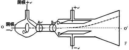 20. 汤姆逊用来测定电子的比荷实验装置如下:真空管内的阴极C发出电子,(不计初速,重力和电子间相互作用), 经过A、B间的电场加速后,穿过A、B的中心小孔沿中心轴O/O的方向进入到两块水平正对的长度为L的平行极板D和E间的区域,当极板间不加偏转电压时,电子束打在荧光屏的中心O'点,形成一个亮点;若在D、E间加上方向向下、场强为E的匀强电场,电子将向上偏转;如果再利用通电线圈在D、E电场区加上一垂直纸面的匀强磁场(图中未画出),调节磁场的强弱,当磁感应强度的大小为B时,荧光斑恰好回到荧光屏中心。接着再去掉电场,电子向下偏转,偏转角为φ。如图所示,求(1)在图中画出磁场B的方向 (2)根据L、E、B和φ,推导电子的比荷的表达式。