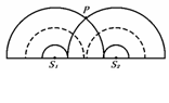 如图示,S1、S2为水波槽中的两个波源,它们分别激起两列水波,图中实线表示波峰,虚线表示波谷.已知两列波的波长分别为λ1、λ2,且λ1>λ2,该时刻在P点为两列波波峰与波峰相遇,则以下叙述中正确的是 ( )