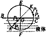 (4分)学校开展研究性学习,某研究性学习小组的同学根据所学的光学知识,设计了一个测量液体折射率的仪器,如图所示.在一个圆形木盘上过其圆心O作两条相互垂直的直径BC、EF,在半径OA上垂直圆盘面插下两枚大头针P1、P2并保持P1、P2的位置不变,每次测量时,让圆盘的BFC部分竖直进入液体中,而且总使得液面与直径BC相平,EF为界面的法线,而后在图中右上方区域观察P1、P2的像,并在圆周上插上大头针P3,使P3正好挡住P1、P2.同学们通过计算,预先在圆周EC部分刻好了折射率的值。这样只要根据P所插的位置,就可直接读出液体折射率的值.则