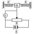 (10分)如图所示为一种加速度仪的示意图。质量为m=1kg的振子两端连有劲度系数均为k=24N/m的轻弹簧,电源的电动势为E=12V,不计内阻,滑动变阻器的总阻值为R=50Ω,有效长度为L=50cm,系统静止时滑动触头位于滑动变阻器正中,这时电压表指针恰好在刻度盘正中。求:⑴系统的加速度a(以向右为正)和电压表读数U的函数关系式。(2)若电压表指针指在满刻度的3/4位置,此时系统的加速度大小和方向如何?