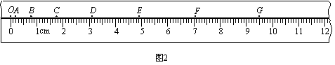 ②电火花计时器接在频率为50Hz的交流电源上,图2为实验中打出的一条纸带,从起始点O开始,将此后连续打出的7个点依次标为A、B、C、D……,