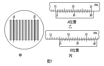 ③已知该装置中双缝间距d=0.50mm,双缝到光屏的距离L=0.50m,在光屏上得到的干涉图样如图7甲所示,分划板在图中A位置时游标卡尺如图7乙所示,则其示数为_________mm;在B位置时游标卡尺如图7丙所示。由以上所测数据可以得出形成此干涉图样的单色光的波长为 m。