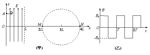 如图(甲)所示,在直角坐标系0≤x≤L区域内有沿y轴正方向的匀强电场,右侧有一个以点(3L,0)为圆心、半径为L的圆形区域,圆形区域与x轴的交点分别为M、N。现有一质量为m,带电量为e的电子,从y轴上的A点以速度v0沿x轴正方向射入电场,飞出电场后从M点进入圆形区域,速度方向与x轴夹角为30°。此时在圆形区域加如图(乙)所示周期性变化的磁场,以垂直于纸面向外为磁场正方向),最后电子运动一段时间后从N飞出,速度方向与进入磁场时的速度方向相同(与x轴夹角也为30°)。求: