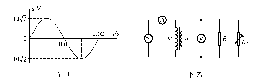 21.图乙中,理想变压器原、副线圈匝数比n1∶n2=10∶1 .原线圈与如图甲所示的交流电连接.电路中电表均为理想电表,定值电阻R1=5Ω,热敏电阻R2的阻值随温度的升高而减小,则