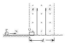 (18分)如图所示,质量m=0.015kg的木块Q放在水平桌面上的A点.A的左边光滑,右边粗糙,与木块间的动摩擦因数μ=0.08.在如图的两条虚线之间存在竖直向上的匀强电场和水平向里的匀强磁场,场强分别为E=20N/C、B=1T.场区的水平宽度d=0.2m,竖直方向足够高.带正电的小球P,质量M=0.03kg,电荷量q=0.015C,以v0=0.5m/s的初速度向Q运动.与Q发生正碰后,P在电、磁场中运动的总时间t=1.0s.不计P和Q的大小,P、Q碰撞时无电量交换,重力加速度g取10m/s2,计算时取