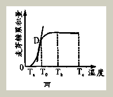 解析:图甲中T0表示淀粉酶催化该反应的最适宜温度,那么在图乙中T0的位置在哪呢?因为最适宜温度表示在该温度下酶的催化活性最高,单位时间内催化反应的生成物最多,而图乙中,D点的斜率最大,所以它能表示单位时间内生成物(麦芽糖)是最多的,即T0的位置(如图丙)。其他答案分别为:在Ta温度下,酶的活性受低温条件的抑制;在Tb温度下,酶因温度过高而丧失活性;Tb至Tc曲线表明温度过高使酶变性失活,没有麦芽糖生成。