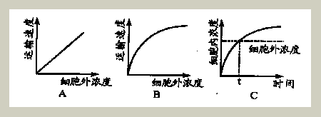 解析:图C中有一根辅线表示细胞外浓度,也就是说t时刻之后,细胞内浓度大于细胞外浓度,而此时的物质还是从细胞膜外进入细胞膜内,即从低浓度进入高浓度,而能够逆浓度差进行运输的,只能是主动运输,所以,⑴C是主动运输,A是自由扩散,B是协助扩散。其余答案依次为:⑵主动运输(C) 主动运输 需要呼吸作用提供能量 ⑶自由扩散 自由扩散 主动运输