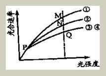 解析:我们在原图中可以作一根辅助线的虚线(如图),设其与曲线①、②、③④分别相交于M、N、Q点。如果我们将曲线①、②比较,点M、N的光强度相同,CO2浓度为0.1%, 不同的是M点的温度为30℃,N点的温度为20℃,但就光合速率而言,M大于N,那么限制N点(实验②)光合作用速率的主要因素是什么呢?只能是温度。同理,将点N与点Q相比较,我们可以得出限制Q相比较,我们可以得出限制Q点(实验④)光合作用速率的主要因素是CO2浓度。利用排除法即可选D。