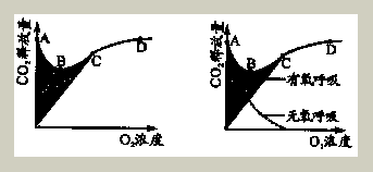由此可见,有氧呼吸中氧气的吸收量等于CO2的释放量,无氧呼吸只释放CO2而不吸收O2,酵母菌在不同氧浓度的情况下,CO2 的总释放量为无氧呼吸和有氧呼吸中CO2 释放量之和,所以呼吸作用最弱点为B点。根据反应方程式①可知,有氧呼吸中CO2 释放量等于O2的吸收量,所以无氧呼吸中CO2 的释放量等于CO2 的总释放量与O2吸收量之差,即阴影部分。根据化学反应式①、②可得出C点进行有氧呼吸,即C点对应的O2浓度下,酵母菌的无氧呼吸为零。绘无氧呼吸曲线右图虚线所示。
