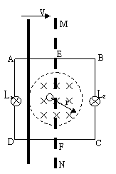 的金属正方形框架ABCD在垂直磁场的平面内放置,正方形中心与圆心O重合。金属框架AD与BC边上分别接有L1、L2两灯,两灯的电阻均为R=2Ω,一金属棒MN平行AD边搁在框架上,与框架电接触良好,棒与框架的电阻均忽略不计。