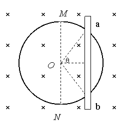 17.如图,半径为R、单位长度电阻为l的均匀导体圆环固定在水平面上,圆环中心为O。匀强磁场垂直水平方向向下,磁感强度为B。平行于直径NON的导体杆,沿垂直于杆的方向向右运动。杆的电阻可以忽略不计,杆与圆环接触良好。某时刻,杆的位置如图,Ðaob=2q,速度为u。求此时刻作用在杆上的安培力的大小。