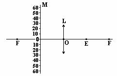 如图所示,某人眼睛在OF的中点E处通过放大镜L观察标尺M,F是此放大镜的焦点。他既能通过放大镜L看到标尺M上一部分刻度,又能直接从镜外看到M上的一部分刻度。试用作图法找出他看不到的M上的那部分范围(将这些部分用记号 ▍涂黑)。