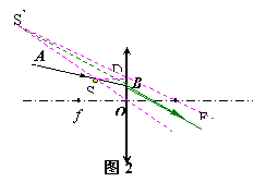 21.在上右图中,AB为射向凸透镜的一条光线,作出这条光线的折射光线。不许用副光轴法,并简单写出作图步骤。