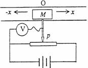 演示位移传感器的工作原理如右图示,物体M在导轨上平移时,带动滑动变阻器的金属滑杆p,通过电压表显示的数据,来反映物体位移的大小x。假设电压表是理想的,则下列说法正确的是