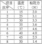53.口香糖的生产已有很长的历史。咀嚼口香糖有很多益处,但其残留物也会带来污染。为了研究口香糖的粘附力与温度的关系,一位同学通过实验,测定了不同温度下除去糖分的口香糖与瓷砖地面的粘附力,得到了如表所示的一组数据: