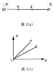 5.如图2(a)所示,直线MN是一个点电荷电场中的电场线。图2(b)所示的是放在电场线上a、b两点的检验电荷电量的大小q与所受电场力的大小F的关系图象,则
