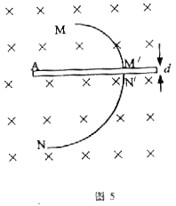 11.(23分)如图5所示,A是一块水平放置的铅板的截面,其厚度为d。MM'和N'N是一重力作用可忽略不计,质量为m,带电量为q的粒子在匀强磁场中的运动轨迹。匀强磁场的磁感应强度为B,方向垂直纸面向里。粒子的运动轨迹与磁场方向垂直,并且粒子垂直穿过铅板。轨迹MM'的半径为r,轨迹N'N的半径为R,且R>r。