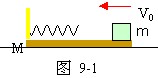 10、如图9-1所示,质量为M=3kg的木板静止在光滑水平面上,板的右端放一质量为m=1kg的小铁块,现给铁块一个水平向左速度V0=4m/s,铁块在木板上滑行,与固定在木板左端的水平轻弹簧相碰后又返回,且恰好停在木板右端,求铁块与弹簧相碰过程中,弹性势能的最大值EP。![]()