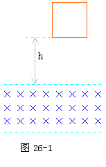 29、如图26-1所示,用密度为D、电阻率为ρ的导线做成正方形线框,从静止开始沿竖直平面自由下落。线框经过方向垂直纸面、磁感应强度为B的匀强磁场,且磁场区域高度等于线框一边之长。为了使线框通过磁场区域的速度恒定,求线框开始下落时的高度h。(不计空气阻力)