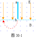 如图30-1所示,虚线上方有场强为E的匀强电场,方向竖直向下,虚线上下有磁感强度相同的匀强磁场,方向垂直纸面向外。ab是一根长L的绝缘细杆,沿电场线放置在虚线上方的场中,b端在虚线上。将一套在杆上的举正电小球从a端由静止释放后,小球先是加速运动,后是匀速运动则达b端。已知小球与绝缘杆间的动因摩擦数μ=0.3,小球的重力可忽略不计。当小球脱离杆进入虚线下方后,运动轨迹是半圆,圆半径为L/3。求:带电小球以 a到b运动过程中克服摩擦力做的功与电场力所做功的比值。