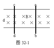 35、如图32-1所示,两根互相平行、间距d=0.4米的金属导轨,水平放置于匀强磁场中,磁感应强度B=0.2T,磁场垂直于导轨平面,金属滑杆ab、cd所受摩擦力均为f=0.2N。两根杆电阻均为r=0.1Ω,导轨电阻不计,当ab杆受力F=0.4N的恒力作用时,ab杆以V1做匀速直线运动,cd杆以V2做匀速直线运动,求速度差(V1- V2)等于多少?