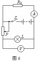 12、如图6所示,电灯L标有“4V、1W”。滑动变阻器R总电阻为50Ω,当滑片P滑至某位置时,L恰好正常发光,此时电流表示数为0.45A,由于外电路发生故障,电灯L突然熄灭,此时电流表示数变为0.5A,电压表示数变为10V,若导线完好,电路中各处接触良好,试问:
