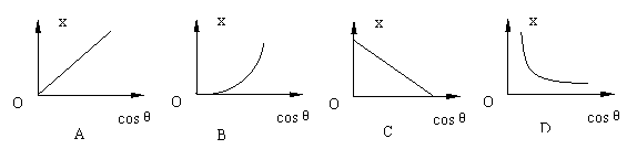 如下图示,一根轻弹簧上端固定在O点,下端拴一个钢球P,球处于静止状态。现对球施加一个方向向右的外力F,使球缓慢偏移,在移动中的每一个时刻,都可以认为钢球处于平衡状态。若外力F方向始终水平,移动中弹簧与竖直方向的夹角θ且弹簧的伸长量不超过弹性限度,则下面给出的弹簧伸长量x与cosθ的函数关系图象最接近的是 ( )