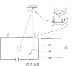 (12分)某研究性学习小组,为探索航天器球形返回舱穿过大气层时所受空气阻力(风力)的影响因素,进行了模拟实验研究。右图为测定风力的实验装置图,其中cD是一段水平放置的长为L的光滑均匀电阻丝,电阻丝阻值较大;一质量和电阻都不计的细长裸金属丝一端固定于0点,另一端悬挂球P,无风时细金属丝竖直,恰与电阻丝在C点接触,0C=H;有风时金属丝将偏离竖直方向,与电阻丝相交于某一点(如图中虚线所示,细 金属丝与电阻丝始终保持良好的导电接触)