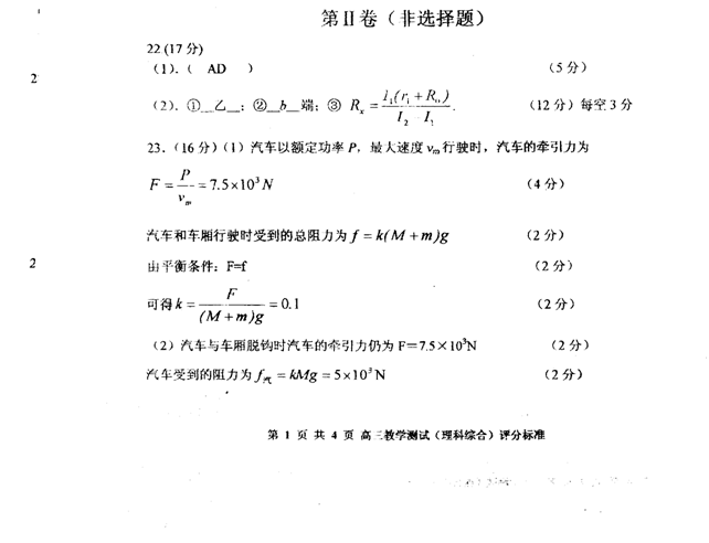 23.(16分)一辆质量为M=5.0×103kg、额定功率为P=1.5×105W的汽车,后面拖了一质量为m=2.5×103kg的车厢,当它在平直的水平公路上行驶时受到的阻力跟汽车和车厢的重力成正比(比例系数为κ),若汽车以额定功率行驶时,最大速率为νm=20m/s。求(g取10m/s2)