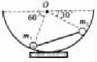 如图所示,一个半球形的碗放在桌面上,碗口水平,O是球心,碗的内表面光滑。一根轻质杆的两端固定有两个小球,质量分别是m1,m2.当它们静止时,m1、m2与球心的连线跟水平面分别成60°,30°角,则碗对两小球的弹力大小之比是 ( )