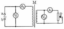 3B.如图所示,M为理想变压器,电表均视为理想电表,输入端a、b接正弦交流电源时,原线圈中电压表和电流表的示数分别为U1和I1,副线圈中电压表和电流表的示数分别为U2和I2,则原线圈与副线圈的匝数之比等于
