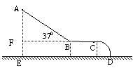 22、(12分)如图所示为儿童娱乐的滑梯示意图,其中AB为斜面滑槽,与水平方向夹角为370,BC为水平滑槽,与半径为0.2m的1/4圆弧CD相切,ED为地面。已知通常儿童在滑槽上滑动时的动摩擦系数是0.5,A点离地面的竖直高度AE为2m,试求:(g取10m/s2)