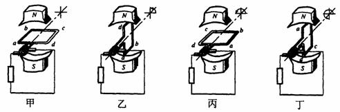 18.如图是交流发电机的示意图。线圈abcd在磁场中匀速转动产生交流电。线圈的ab边和cd边连在两个金属滑环上,两个滑环通过金属片做的电刷和外电路相连。当线圈沿逆时针方向转动时,关于电流方向以下判断正确的是 ( )