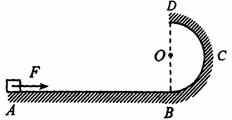 22.(16分)如图,水平地面AB=10.0m。BCD是半径为R=0.9m的光滑半圆轨道,O是圆心,DOB在同一竖直线上。一个质量m=1.0kg的物体静止在A点。现用F=10N的水平恒力作用在物体上,使物体从静止开妈做匀加速直线运动。物体与水平地面间的动摩擦因数μ=0.5。当物体运动到B点时撤去F。之后物体沿BCD轨道运动,离开最高点D后落到地上的P点(图中未画出)。G取10m/s2。求: