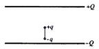 一平行板电容器的电容为C,两板间的距离为d,上板带正电,电量为Q,下板带负电,电量也为Q,它们产生的电场在很远处的电势为零。两个带异号电荷的小球用一绝缘刚性杆相连,小球的电量都为q,杆长为l,且l<d。现将它们从很远处移到电容器内两板之间,处于图示的静止状态(杆与板面垂直),在此过程中电场力对两个小球所做总功的大小等于多少?(设两球移动过程中极权上电荷分布情况不变)