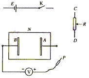 电源E(电动势为12V,内阻不计),木板N(板上从下往上依次叠放白纸、复写纸、导电纸各一张),两个金属条A、B(平行放置在导电纸上,与导电纸接触良好,用作电极),滑线变阻器R(其总阻值小于两平行电极间导电纸的电阻),直流电压表V(量程为6V,内阻很大,其负接线柱与B极相连,正接线柱与探针P相连),开关K。