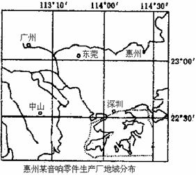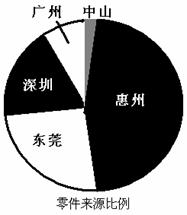 (6分)读“惠州某音响零件生产厂地域分布图”及“零件来源比例图”,回答有关问题: