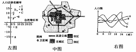 (3)A是该城的中心商务区,右图中能反映A区人口日变化特点的是 (填曲线代码)。