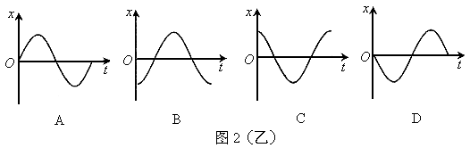 5. 一个水平放置的弹簧振子在A、B两点间做简谐运动,O为振子的平衡位置,如图2(甲)所示。设水平向右方向为正方向,以某一时刻作计时起点(t=0),经1/4周期,振子具有正方向最大加速度。那么,在图2(乙)所示的几个振动图像中(x表示振子离开平衡位置的位移),能正确反映该振子振动情况的是( )